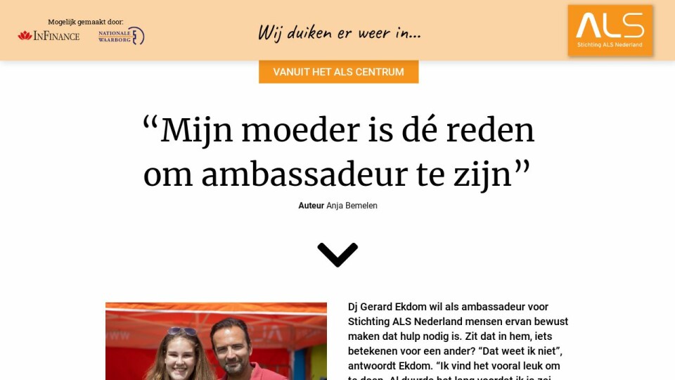 Ekdom had tijd nodig om de confrontatie met ALS aan te gaan. “Dat had natuurlijk te maken met de dood van mijn moeder. Ik moest nog wachten. Zo voelde het. Terwijl mijn moeder juist mijn enige en natuurlijke reden is om ambassadeur te worden.”