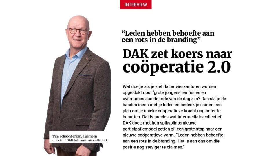Wat doe je als je ziet dat advieskantoren worden opgeslokt door ‘grote jongens’ en fusies en overnames aan de orde van de dag zijn? Dan sla je de handen ineen met je leden en bedenk je samen een plan om je unieke coöperatieve kracht nog beter te benutten. Dat is precies wat intermediairscollectief DAK doet: met hun spiksplinternieuwe participatiemodel zetten zij een grote stap naar een nieuwe coöperatieve vorm. “Leden hebben behoefte aan een rots in de branding. Het is aan ons om die positie nog steviger te claimen.”