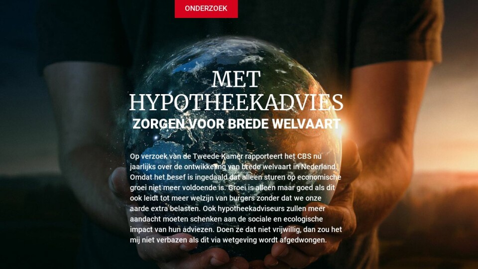 Op verzoek van de Tweede Kamer rapporteert het CBS nu jaarlijks over de ontwikkeling van brede welvaart in Nederland. Omdat het besef is ingedaald dat alleen sturen op economische groei niet meer voldoende is. Groei is alleen maar goed als dit ook leidt tot meer welzijn van burgers zonder dat we onze aarde extra belasten. Ook hypotheekadviseurs zullen meer aandacht moeten schenken aan de sociale en ecologische impact van hun adviezen. Doen ze dat niet vrijwillig, dan zou het mij niet verbazen als dit via wetgeving wordt afgedwongen.