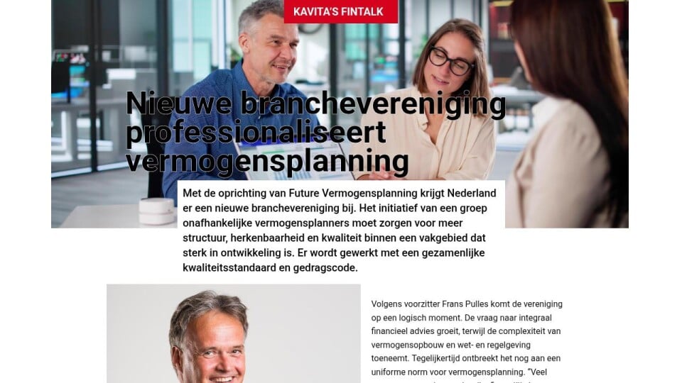 Met de oprichting van Future Vermogensplanning krijgt Nederland er een nieuwe branchevereniging bij. Het initiatief van een groep onafhankelijke vermogensplanners moet zorgen voor meer structuur, herkenbaarheid en kwaliteit binnen een vakgebied dat sterk in ontwikkeling is. Er wordt gewerkt met een gezamenlijke kwaliteitsstandaard en gedragscode.