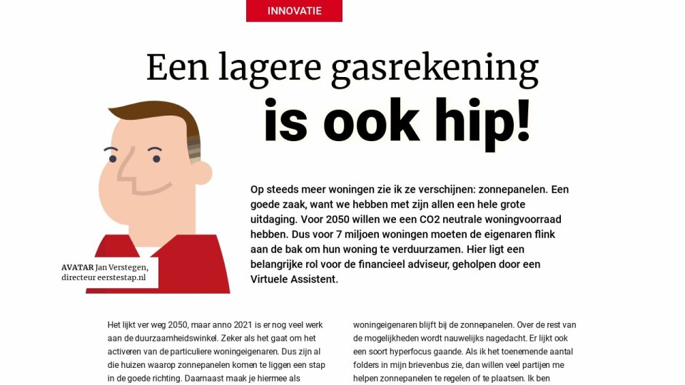Op steeds meer woningen zie ik ze verschijnen: zonnepanelen. Een goede zaak, want we hebben met zijn allen een hele grote uitdaging. Voor 2050 willen we een CO2 neutrale woningvoorraad hebben. Dus voor 7 miljoen woningen moeten de eigenaren flink aan de bak om hun woning te verduurzamen. Hier ligt een belangrijke rol voor de financieel adviseur, geholpen door een Virtuele Assistent.
