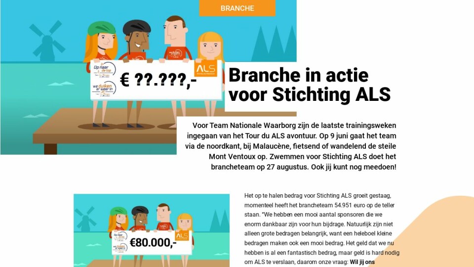 Het op te halen bedrag voor Stichting ALS groeit gestaag, momenteel heeft het brancheteam 54.951 euro op de teller staan. “We hebben een mooi aantal sponsoren die we enorm dankbaar zijn voor hun bijdrage. Natuurlijk zijn niet alleen grote bedragen belangrijk, want een heleboel kleine bedragen maken ook een mooi bedrag. Het geld dat we nu hebben is al een fantastisch bedrag, maar geld is hard nodig om ALS te verslaan, daarom onze vraag: Wil jij ons sponseren? Je kunt een donatie doen via onze teampagina ‘Op naar de Top voor Tim, Monique en alle anderen’.”