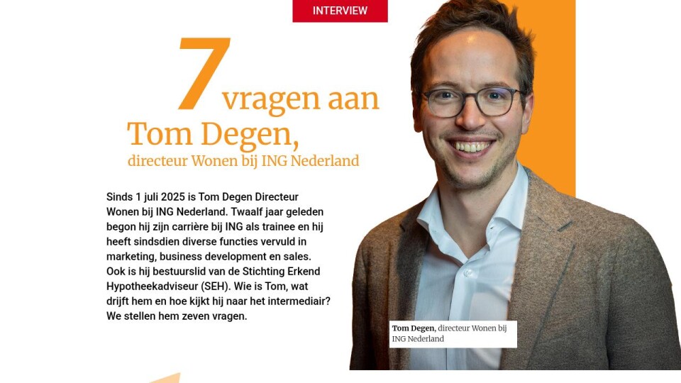 Sinds 1 juli 2025 is Tom Degen Directeur Wonen bij ING Nederland. Twaalf jaar geleden begon hij zijn carrière bij ING als trainee en hij heeft sindsdien diverse functies vervuld in marketing, business development en sales. Ook is hij bestuurslid van de Stichting Erkend Hypotheekadviseur (SEH). Wie is Tom, wat drijft hem en hoe kijkt hij naar het intermediair? We stellen hem zeven vragen.