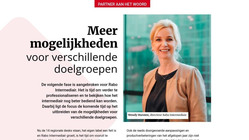 Via haar reguliere kanalen zoals de wekelijkse nieuwsbrief, de Rabo Intermediaire Omgeving (RIO) en LinkedIn houdt Rabo Intermediair iedereen op de hoogte van de optimalisaties en nieuwe proposities. “Afhankelijk van het onderwerp zullen we intermediairs ook gericht benaderen om hen goed te informeren”, aldus Horsten. “Adviseurs kunnen natuurlijk altijd terecht bij hun accountmanager en het expertteam op de intermediairsdesk in hun regio. We denken graag mee en hebben alles in huis om het intermediair verder te helpen.”