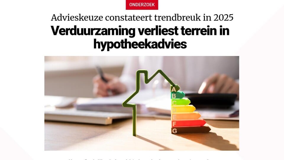 Het onafhankelijke platform Advieskeuze heeft een analyse uitgevoerd van meer dan 55.000 consumentenreviews over hypotheekadviseurs. Uit de resultaten blijkt dat het onderwerp verduurzaming in 2025 10% minder vaak wordt besproken tijdens hypotheekadviesgesprekken dan een jaar eerder. Dat is de eerste daling sinds 2021, het jaar waarin Advieskeuze dit onderwerp begon te monitoren. Terwijl verduurzaming nog altijd een speerpunt is in beleid en media, lijkt het thema in de financiële adviespraktijk terrein te verliezen.