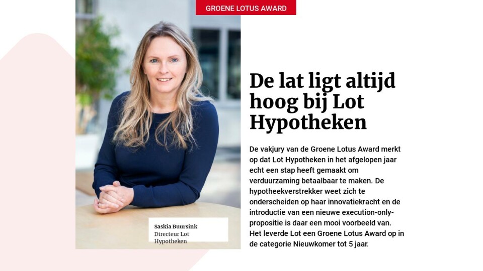 Het is juist deze ontwikkelkracht van Lot Hypotheken die de vakjury heeft gewaardeerd met de Groene Lotus Award Nieuwkomer <5 jaar.