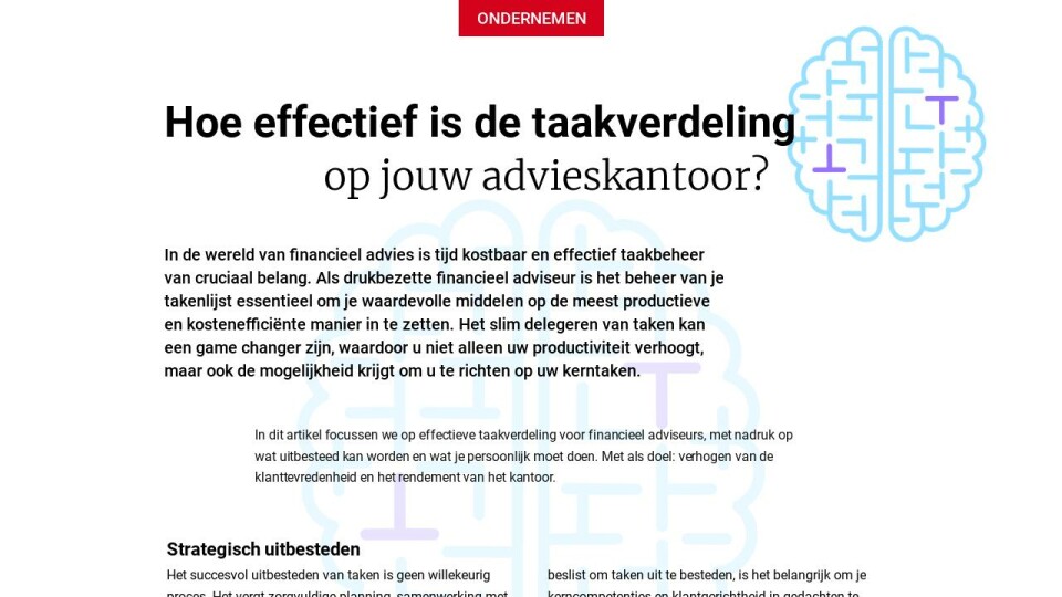 In dit artikel focussen we op effectieve taakverdeling voor financieel adviseurs, met nadruk op wat uitbesteed kan worden en wat je persoonlijk moet doen. Met als doel: verhogen van de klanttevredenheid en het rendement van het kantoor.