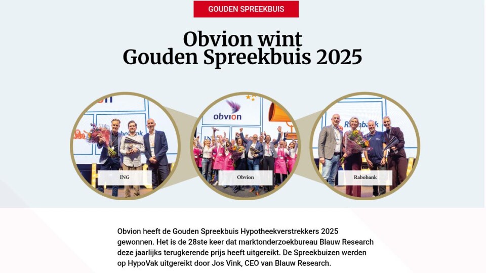 Obvion heeft de Gouden Spreekbuis Hypotheekverstrekkers 2025 gewonnen. Het is de 28ste keer dat marktonderzoekbureau Blauw Research deze jaarlijks terugkerende prijs heeft uitgereikt. De Spreekbuizen werden op HypoVak uitgereikt door Jos Vink, CEO van Blauw Research.