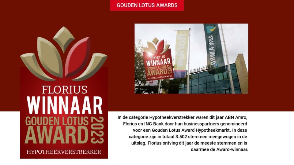 In de categorie Hypotheekverstrekker waren dit jaar ABN Amro, Florius en ING Bank door hun businesspartners genomineerd voor een Gouden Lotus Award Hypotheekmarkt. In deze categorie zijn in totaal 3.502 stemmen meegewogen in de uitslag. Florius ontving dit jaar de meeste stemmen en is daarmee de Award-winnaar.