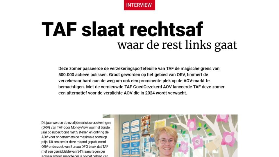 Deze zomer passeerde de verzekeringsportefeuille van TAF de magische grens van 500.000 actieve polissen. Groot geworden op het gebied van ORV, timmert de verzekeraar hard aan de weg om ook een prominente plek op de AOV-markt te bemachtigen. Met de vernieuwde TAF GoedGezekerd AOV lanceerde TAF deze zomer een alternatief voor de verplichte AOV die in 2024 wordt verwacht.