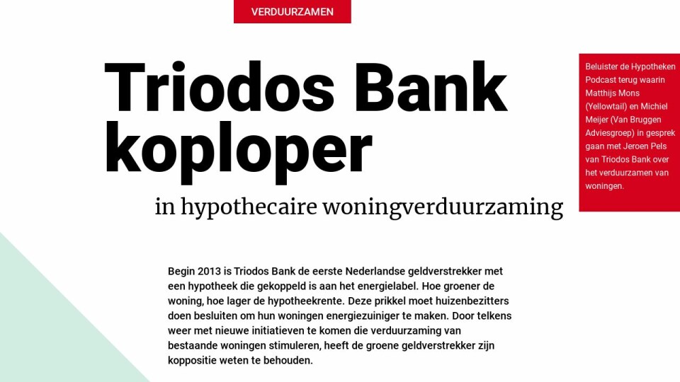 Begin 2013 is Triodos Bank de eerste Nederlandse geldverstrekker met een hypotheek die gekoppeld is aan het energielabel. Hoe groener de woning, hoe lager de hypotheekrente. Deze prikkel moet huizenbezitters doen besluiten om hun woningen energiezuiniger te maken. Door telkens weer met nieuwe initiatieven te komen die verduurzaming van bestaande woningen stimuleren, heeft de groene geldverstrekker zijn koppositie weten te behouden.